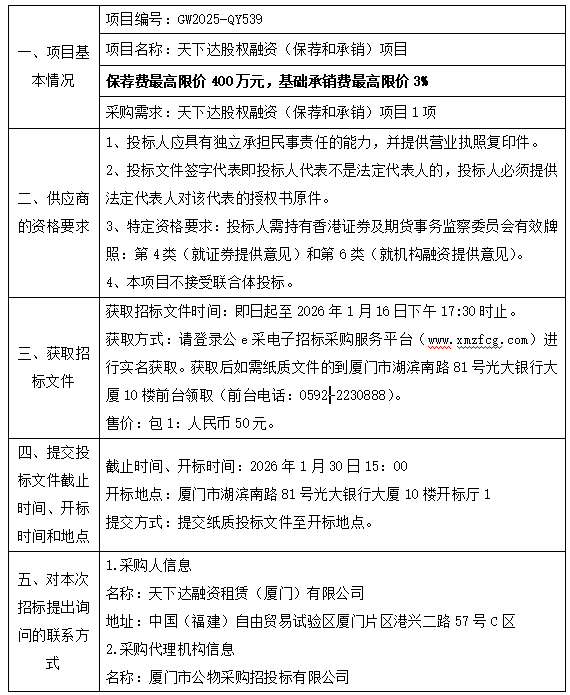 厦门公物—公开招标—GW2025-QY539—天下达股权融资(保荐和承销)项目—招标公告
